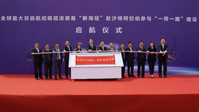 On April 2, the Sailing Ceremony of world’s leading non-self-propelled cutter suction dredger “New Haixu”, invested by Jiangsu Haihong Construction Engineering Co., Ltd and built by Jiangsu Haixin Shipping Heavy Industries Co., Ltd (Jiangsu Haixin), for the participating of “the Belt and Road Initiative Construction” at Saudi Arabia, was held at the site of Jiangsu Haixin. “New Haixu”s this trip is to take part in the building of artificial island, which shall serve the offshore oil and gas extraction projects of Saudi Aramco Oil Company with operation span of 820 days.