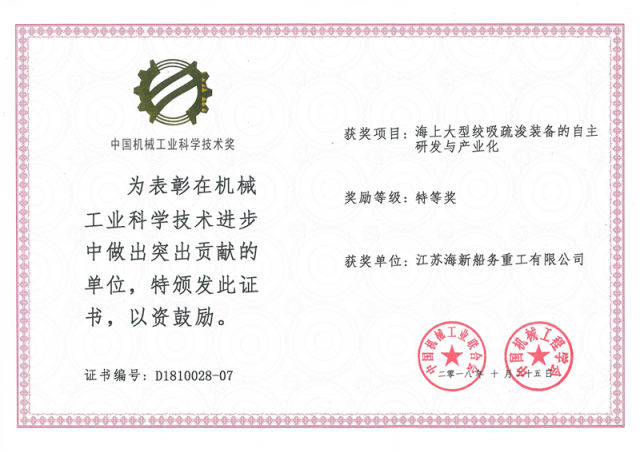Warmly celebrate haixin heavy industry won the special award of China machinery industry science and technology....