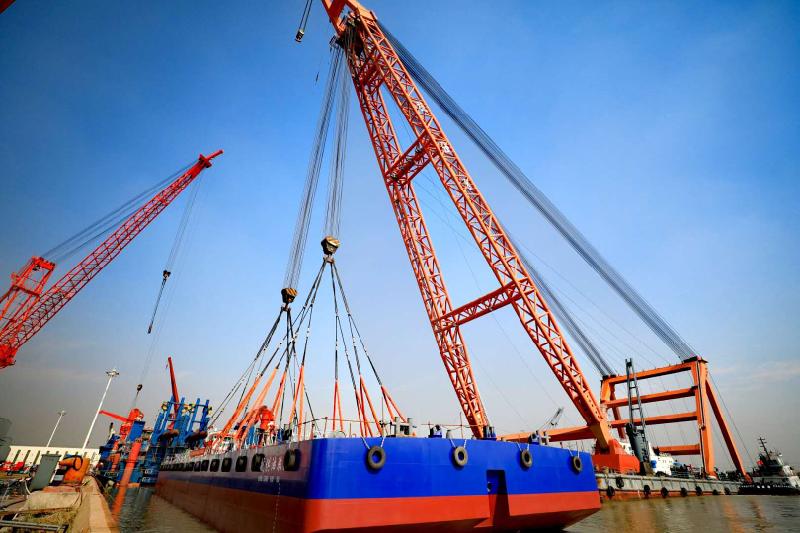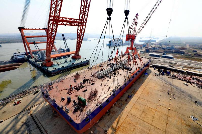 日前,由江蘇海新船務(wù)重工有限公司承建的上海航道物流有限公司5000噸油駁船“航供油駁9”輪在江蘇海新重工碼頭,由超大型1800T浮吊船“穩(wěn)強8”輪分別由主船體和上建兩次吊裝下水。