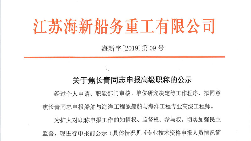 2019年08月15日,關于我司焦長青同志申報高級職稱的公示...
